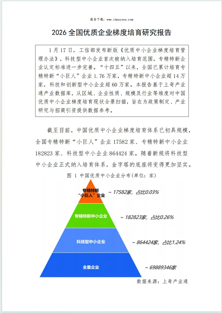 1月17日,工信部发布新版《优质中小企业梯度培育管理办法》,科技型中小企业首次被纳入培育范围,专精特新企业认定标准进一步完善。“十四五”以来,全国已累计培育专精特新“小巨人”企业1.76万家,专精特新中小企业超14万家,科技和创新型中小企业超60万家。本报告基于产业通产业数据库,从区域、企业性质、规模及行业等维度对中国优质中小企业梯度培育现状全景扫描,旨在为政策制定、产业研究与招商引资提供数据参考。