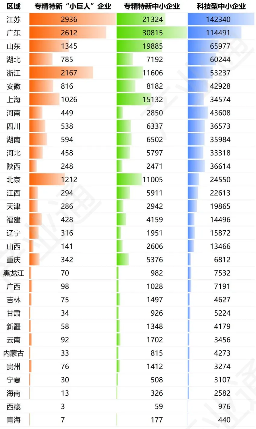 从省级分布看,长三角、珠三角及京津冀三大城市群构成了优质中小企业分布的核心区域。江苏省在专精特新“小巨人”企业和科技型中小企业数量上均位居全国第一,显示出深厚的制造业家底与强劲的创新动能。广东省则在专精特新中小企业总量上领跑全国。这意味着广东拥有规模最大、质量优异的后备梯队,未来晋级“小巨人”的潜力巨大。