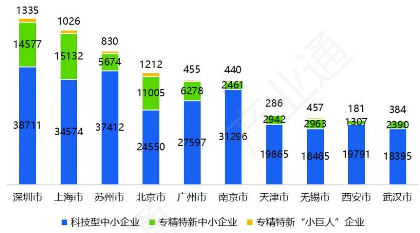 从城市分布来看,深圳市在专精特新“小巨人”企业和科技型中小企业数量上位居榜首,凸显其作为科创中心的实力。上海市的专精特新中小企业数量突出,展现了其成熟、均衡的产业生态。苏州、北京、广州等城市紧随其后,共同构成全国优质中小企业发展的第一梯队。