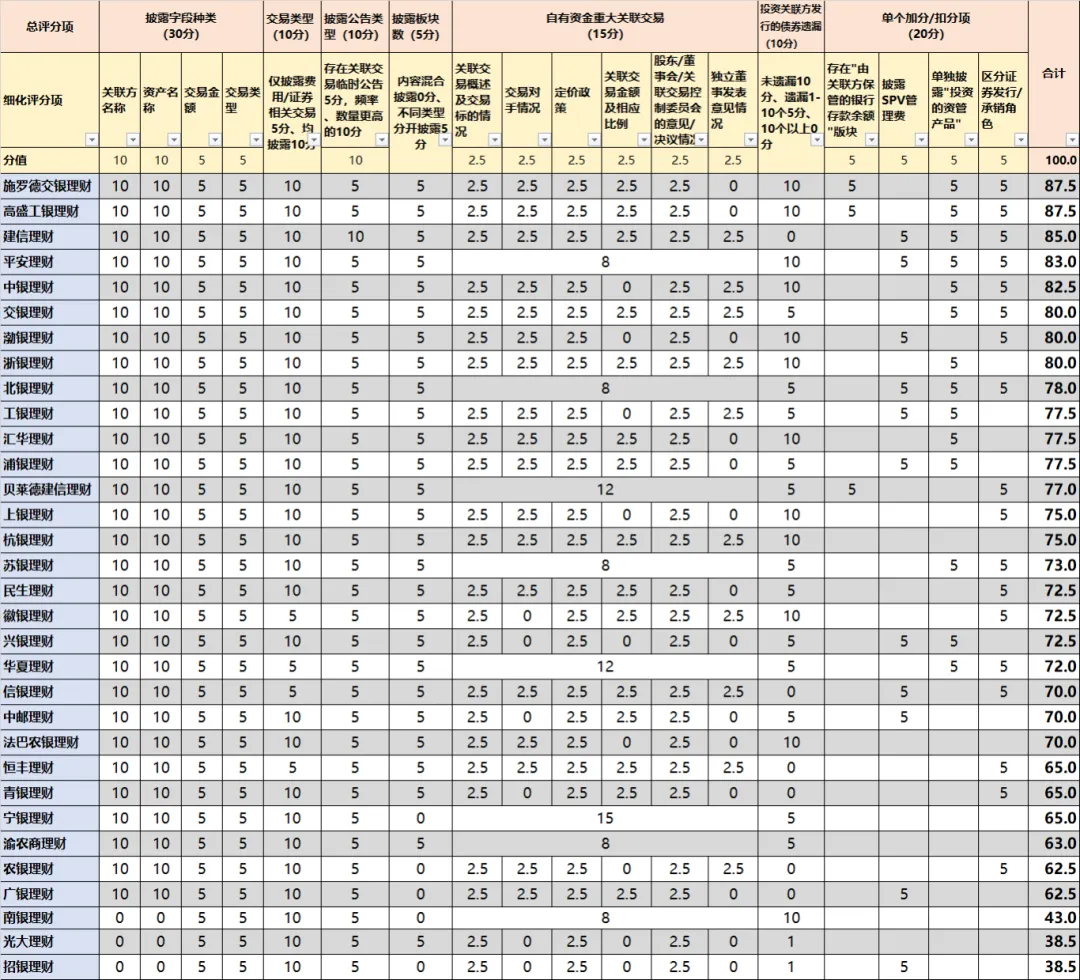 一、理财子公司“关联交易”披露质量总得分评估
