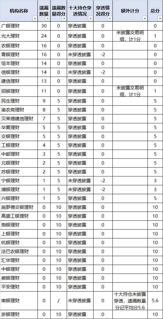遗漏数量在10个以上的机构有8家,分别为:广银理财、农银理财、青银理财、恒丰理财、信银理财、建信理财、招银理财、光大理财,其中招银理财和光大理财未披露具体单笔交易明细,所以无法真正核实十大持仓里面的关联方证券投资是否体现在季报关联交易模块,因为这两家机构只披露关联交易总金额,故象征性计1分,而不是0分。