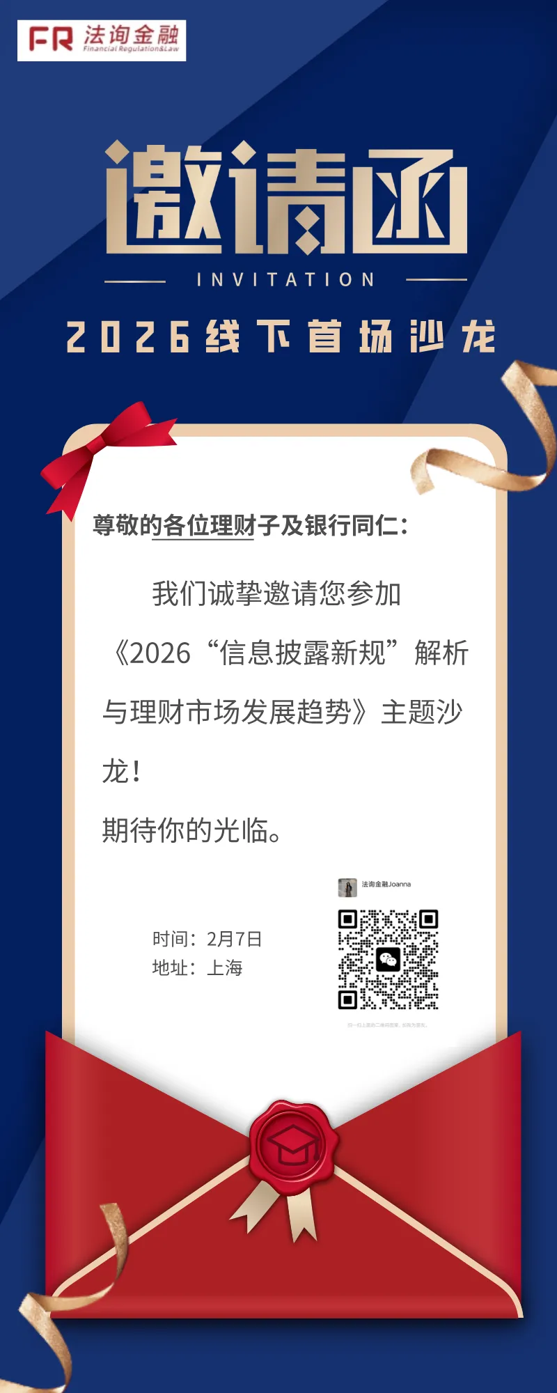 随着资管新规深化实施、财富管理市场加速转型,中小银行理财代销业务正面临产品结构调整、客户需求升级与数字化转型的多重挑战。为探讨行业新趋势、共话业务破局路径,我们拟于近期举办“银行信息披露新规”主题沙龙,诚邀您拨冗出席,共襄行业交流盛事。