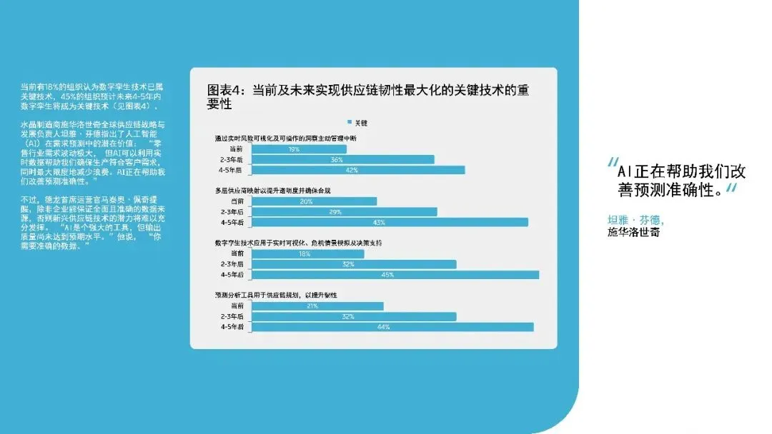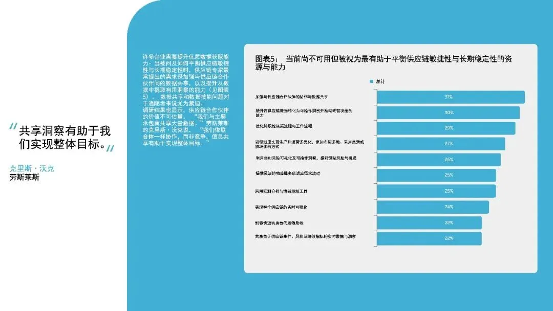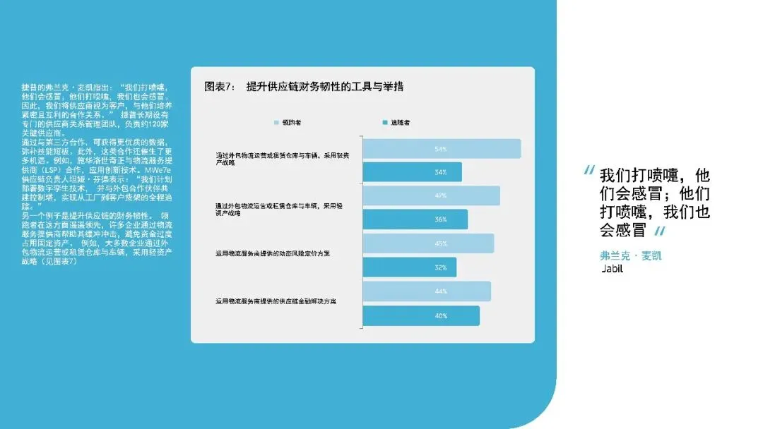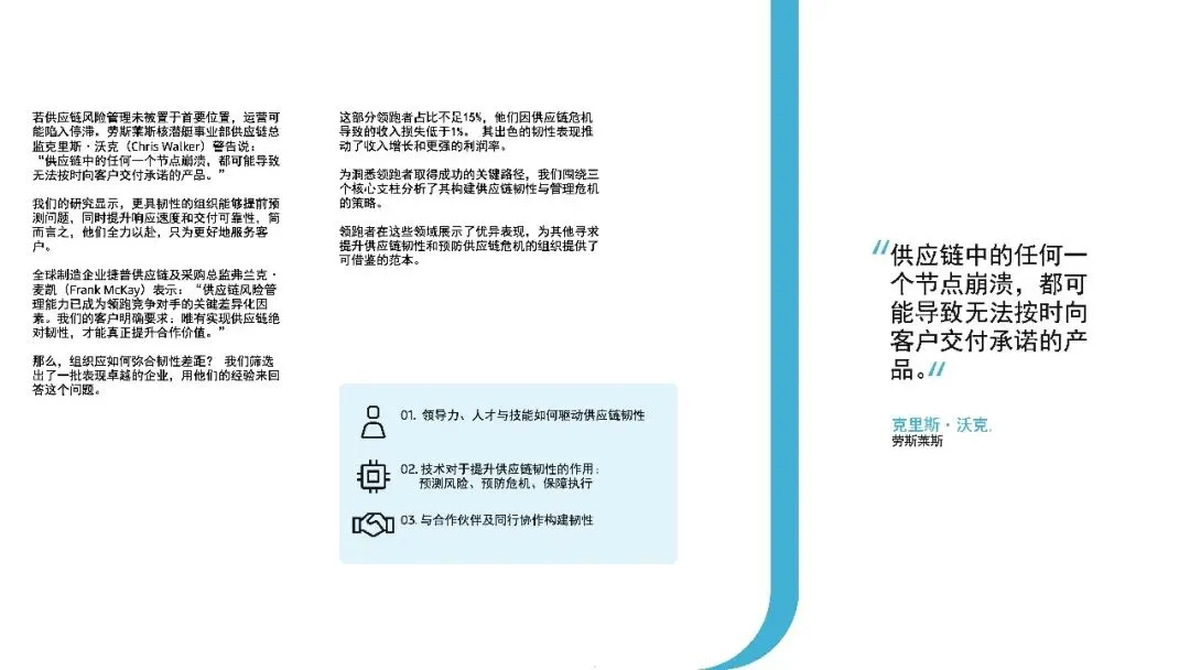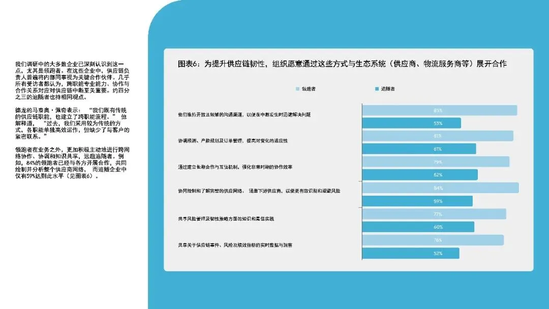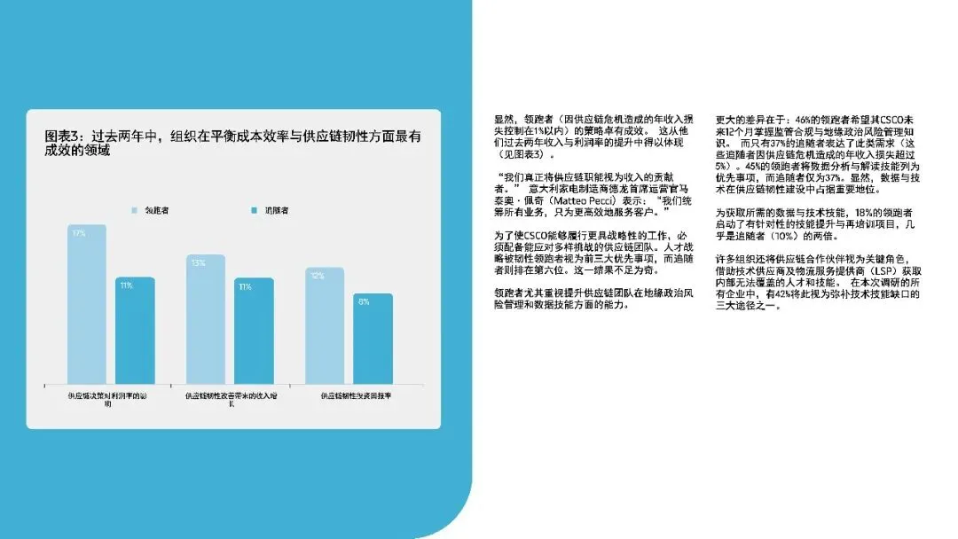 领导力、人才与技能是驱动供应链韧性的核心支柱。领跑企业中,首席供应链官(CSCO)扮演着关键战略角色,被视为推动收入增长的引擎,企业董事会也高度重视供应链韧性。相比之下,收入损失超5%的追随者企业,其CSCO更多聚焦于运营效率与成本控制。领跑者将人才战略列为前三大优先事项,尤其注重团队在地缘政治风险管理和数据技能方面的提升,相关技能培训投入近乎追随者的两倍,同时还通过供应链合作伙伴弥补内部人才缺口。