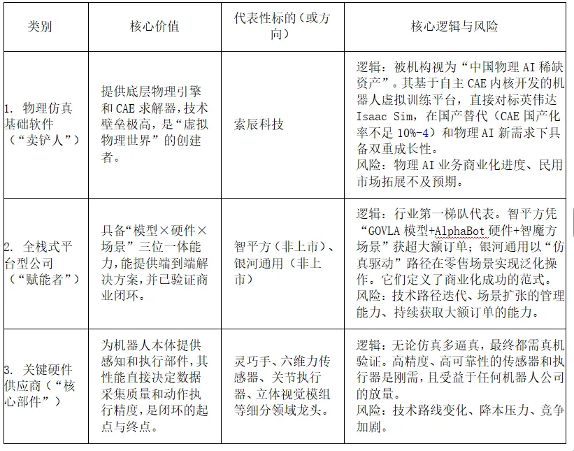 基于以上分析,2026年的投资上半年聚焦确定性,布局“基座”与“供应链”如:国产替代与物理AI基座。关注以索辰科技为代表的国产CAE及仿真软件厂商,其传统业务受益于工业软件国产化,新业务则站在物理AI需求爆发的起点,具备估值弹性。核心硬件供应链。随着特斯拉Optimus V3等产品步入量产前夜,聚焦已经进入主流机器人公司供应链、技术壁垒高的灵巧手、力矩传感器、谐波减速器、空心杯电机等环节的龙头公司。这是产业放量初期最确定的受益环节。下半年则追踪验证期,甄别“真龙头”。密切关注头部平台型公司(如智平方、银河通用等)的订单落地情况、客户复购率以及标杆场景的规模化复制进展。投资逻辑从“主题预期”向“基本面验证”切换。能够持续公布大额、可持续订单的企业,将证明其商业化能力,有望享受估值溢价。全年关注场景突破与政策催化,紧密跟踪仓储物流、汽车制造等核心场景的落地新闻和行业案例。关注国家及地方对“具身智能”作为未来产业的相关配套政策和支持措施,这将是板块情绪的重要催化剂。