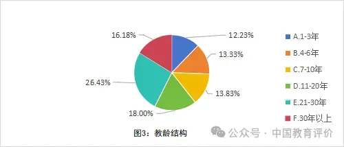 教师从教年限从1~3年至30年以上分布比较均衡,1~3年教龄教师占比12.23%,4~6年教龄教师占比13.33%,7~10年教龄教师占比13.83%,11~20年教龄教师占比18.00%,21~30年教龄教师占比26.43%,30年以上教龄教师占比16.18%,调研样本在年龄层次上具有较好的代表性(见图3)。