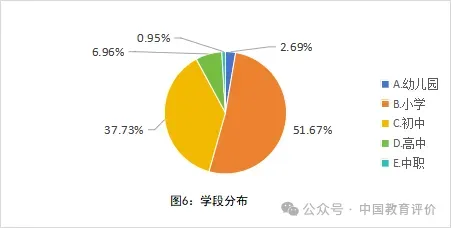 从职称来看,副高级及以上教师占比21.44%,中级职称教师占比40.92%,初级及未评级教师合计占比37.64%,与我国中小学教师岗位设置比例相近(见图5)。