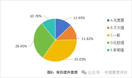 1.学历提升意愿。数据显示,教师学历提升意愿总体较强。选择“比较强”+“非常强”的合计占比40.18%(见图8),其中40周岁以下教师愿望更加强烈,选择“比较强”+“非常强”的占比57.00%。