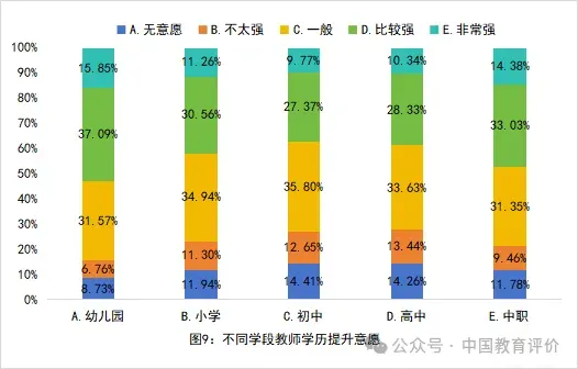 教师学历提升意愿还存在显著的学段差异。52.94%的幼儿园教师和47.41%的中职教师学历提升意愿(“比较强”+“非常强”)显著高于其他学段教师。初中教师的学历提升意愿最低,“比较强”+“非常强”仅占37.14%,“无意愿”比例高达14.41%(见图9)。由于小学教师人数最多(42053人),提升学历意愿强烈(“比较强”+“非常强”)占比达41.82%,应引起广泛关注,给教师开通提升学历的通道和建立相应的制度机制。