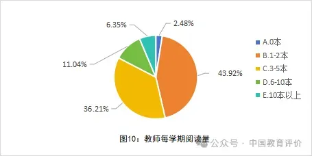 2.阅读习惯。教师的整体阅读量偏低。82.61%的教师一学期阅读量≤5本,阅读量为1~2本的占比43.92% ,阅读量3~5本的占比36.21%(见图10)。