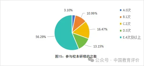 校本研修已成为教师专业提升的主要模式,超半数教师(56.29%)一学期参与校本研修达4次及以上,说明校本研修已受到中小学校的高度重视(见图15)。