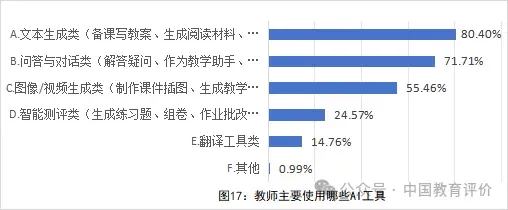 进一步调查发现,教师对AI工具的应用已深度融入教学核心环节,并呈现出鲜明的场景化特征。文本生成类工具以80.40%的使用率占据首位,表明教师已经广泛认可AI工具在辅助撰写教案、起草文稿等方面的效能。问答对话类(71.71%)与图像/视频生成类工具(55.46%)紧随其后,成为教师答疑解惑、生成个性化教学资源方面的重要途径。相较之下,智能测评类工具(24.57%)的使用率较低(见图17),说明教师在应用AI设计作业、生成试卷、智能批改、分析学情等方面仍有较大提升空间;学校应加大相关AI工具的配备和使用培训。
