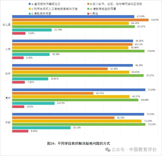 各学段教师解决疑难问题的方式存在显著差异。幼儿园教师更偏向选择“在小红书、论坛、贴吧等网络社区求助”,占比74.97%,远超其他学段(小学66.11%、初中52.50%、高中44.72%、中职56.22%);72.83%小学教师和72.27%的初中教师选择“请教有经验同事”,说明义务教育阶段教师更加青睐同事经验;而73.20%的高中教师选择“查阅相关书籍或论文”,说明高中教师更倾向于自主解决问题。所有学段教师选择“利用生成式人工智能”解决问题的比例都比较高,说明生成式人工智能在各学段教师中均获得了较高的认同和积极的使用(见图24)。