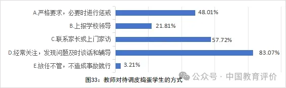 教师教育教学中面对“问题生”的实际问题,采取积极干预、家校协同等方式为主。对于调皮捣蛋、不守纪律或不爱学习的学生,83.07%的教师选择“经常关注,发现问题及时谈话和辅导”。这体现出多数教师秉持积极主动的教育态度,比较关注学生动态。57.72%的教师会选择“联系家长或上门家访”。表明超半数教师重视家校合作,认识到家庭在学生成长中的关键作用,通过协同制定教育策略,形成家校育人合力(见图33)。