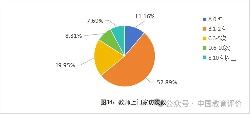 3.家访情况。总体来看,教师上门家访的次数不多。 一学期完全没有上门家访的教师占11.16%,距离教育行政部门倡导的全员家访存在较大差距。上门家访1~2次和3~5次的分别为52.89%和19.95%,难以覆盖所教班级大部分学生,上门家访6~10次和10次以上的分别为8.31%和7.69%,反映出一部分教师虽然认识到家校沟通协同育人的重要性,但没有真正付诸行动(见图34)。
