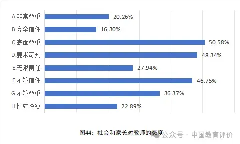 社会与家长对教师的态度深刻影响教师职业认同感与教学投入度。从教师视角看,社会与家长对教师的态度呈多元化特征,且积极态度占比不高。教师认为社会与家长“非常尊重”教师、“完全信任”教师的分别为20.26%和16.30%。50.58%的教师认为社会与家长只是“表面尊重”;认为社会和家长“要求苛刻”“不够信任”和“不够尊重”的分别达到48.34%、46.75%和36.37%。这些负面态度催生了教师的职业自卑和焦虑。27.94%的教师认为社会与家长对其责任边界认知模糊,将学生成长的多重责任过度归集到教师身上,教师承担着“无限责任”。此外,还有22.89%的教师认为社会与家长“比较冷漠”,这将严重影响教师对学生的态度(见图44)。