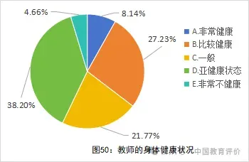 5.身体健康状态。教师整体健康状态堪忧,需要加强身体的锻炼与调养。数据显示,自评处于“亚健康”状态的教师占比最高(38.20%),而认为自己“非常健康”的教师仅占8.14%。高达42.86%的教师(“亚健康”+“非常不健康”)已明确处于不健康状态,情况不容乐观(见图50)。
