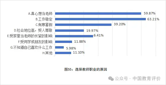 3.职业规划。教师职业选择是稳定保障、个人理想、职业福利、家庭传承等多重因素交织的结果。其中,职业理想与稳定保障共同构成教师职业选择的核心驱动力。63.21%的教师选择这份职业的原因是“工作稳定”,占比最高。其次,59.87%的教师选择这份职业的原因是“真心想当老师”。需要关注的是,还有5.98%的教师“不知道自己喜欢什么”。认为教师社会地位高,受人尊敬的仅占19.97%(见图55)。