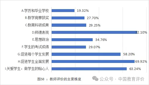 1.教师评价体系。教师普遍认为,对教师的评价需坚持师德为先、育人为本的核心理念。72.10%的教师认为师德是评价教师的基石。其次,“促进学生全面发展”(69.92%)、“关爱学生,做学生的贴心人”(63.24%)、“促进每个学生发展”(58.20%)紧随其后。说明教师认为评价应聚焦教师的职业素养与育人实效。从评价维度来看,“学历和毕业学校”“教学竞赛获奖”的认同度占比较低,表明教师普遍主张相对弱化“硬件背景”与“竞赛成果”在评价中的权重(见图58)。