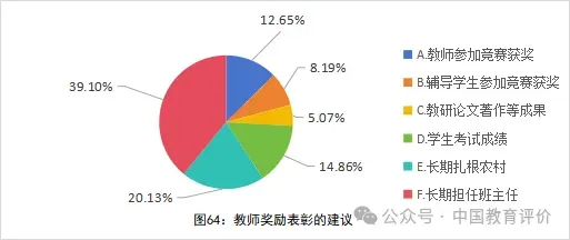 教师群体高度认可班主任岗位的价值,39.10%的教师呼吁加大对班主任的表彰奖励,肯定其付出,强化班级育人“主阵地”作用。20.13%的教师呼吁加大对长期扎根农村的教师的表彰奖励,肯定其为乡村教育发展所做出的默默奉献;14.86%的教师认为表彰奖励应适当兼顾“学生考试成绩”;12.65%和8.19%的教师肯定“教师参赛获奖”和“辅导学生参赛获奖”在评价中的价值;仅5.07%的教师认可将“教研论文著作成果”作为评价依据。(见图64)。