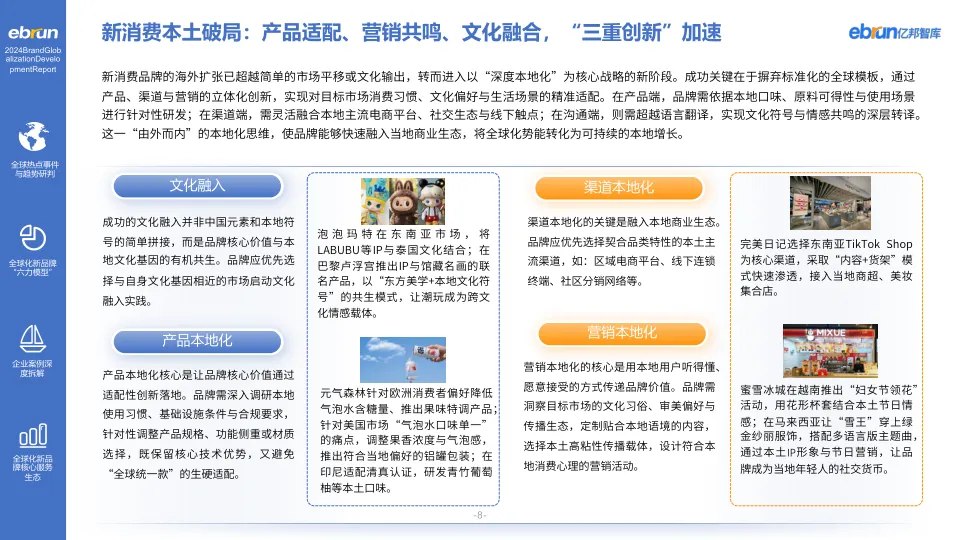 - 成功=产品适配(如元气森林调整配方)+ 营销共鸣(如蜜雪冰城本土IP)+ 文化融合(如泡泡玛特IP联名)。