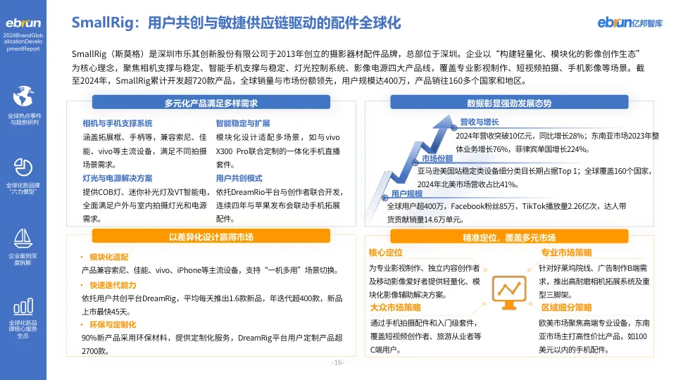 - SmallRig(斯莫格):靠用户共创(DreamRig平台)和高频迭代(每天1.6款新品),打造全球领先的摄影配件生态。