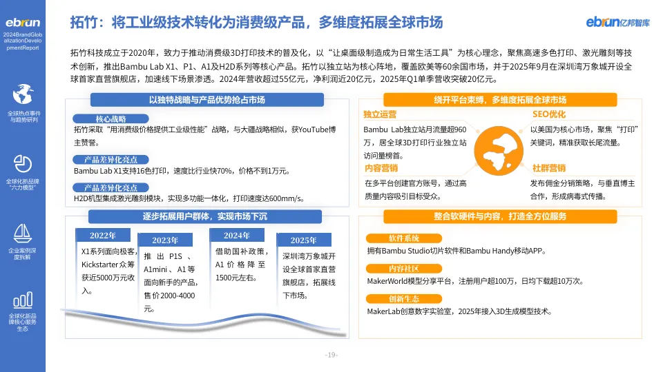 - 拓竹科技:以技术驱动(自研芯片、高速打印)构建“机器-模型-耗材”(3M)闭环,并通过DTC独立站掌握品牌主动权。