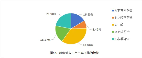 进一步分析发现,40.17%的教师(“比较符合”+“非常符合”)因为人口出生率下降而对教师职业表示担忧,其原因可能是对未来学生规模缩减、岗位需求调整的预判,说明人口变化趋势已触动部分教师的职业安全感。这些担忧可能影响教师职业投入度与队伍稳定性,需要重视对教师的心理疏解(见图57)。