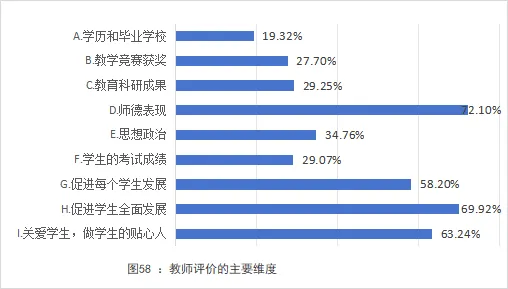 (1)教师评价体系。教师普遍认为,对教师的评价需坚持师德为先、育人为本的核心理念。72.10%的教师认为师德是评价教师的基石。其次,“促进学生全面发展”(69.92%)、“关爱学生,做学生的贴心人”(63.24%)、“促进每个学生发展”(58.20%)紧随其后。说明教师认为评价应聚焦教师的职业素养与育人实效。从评价维度来看,“学历和毕业学校”“教学竞赛获奖”的认同度占比较低,表明教师普遍主张相对弱化“硬件背景”与“竞赛成果”在评价中的权重(见图58)。