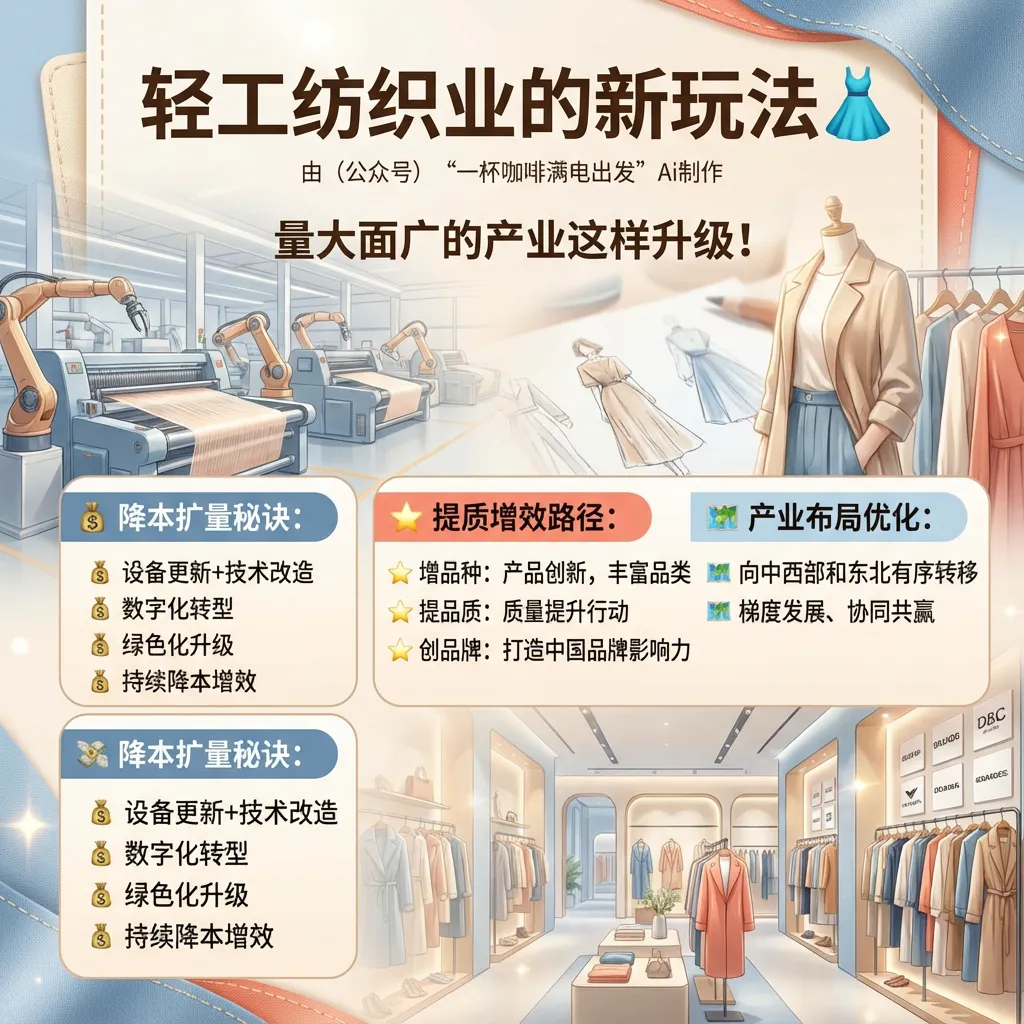对轻工、纺织等量大面广的产业,关键在于降本扩量、提质增效。轻工、纺织行业规模体量大、产品种类多、覆盖范围广,在保障民生、繁荣市场、扩大出口、吸纳就业等方面发挥着重要作用。“十五五”时期,要加快产品创新,丰富产品品类和供给特色,实现增品种、提品质、创品牌。支持企业开展设备更新和技术改造,加快应用先进适用技术,推动数字化转型和绿色化升级,持续降本增效。开展重点消费品质量提升行动,提升强制性产品能效标准和安全标准,保障强制性国家标准“红底线”作用发挥,强化质量支撑和标准引领。推进品牌建设,高质量办好中国品牌日活动,持续开展品牌创建和宣传引导,提升中国品牌知名度和影响力。完善产业在国内梯度有序转移的协作机制,引导轻工、纺织等产业向中西部和东北地区有序转移。