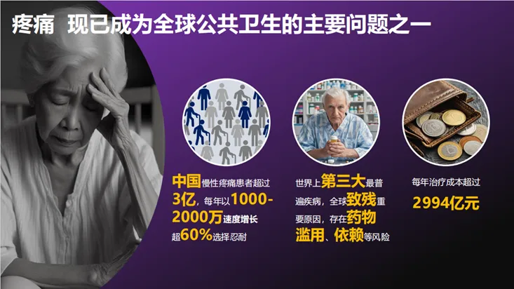 慢性疼痛是指持续或反复发作超过3个月的疼痛,已成为全球性的重大公共卫生挑战。根据世界卫生组织(WHO)的数据,全球约有20%的人口遭受慢性疼痛的困扰,在老年人群中的比例更高达30-50%。疼痛相关的医疗支出和经济损失占全球疾病负担的相当大比例。