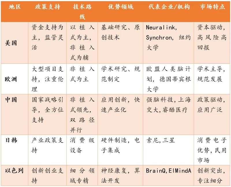 非植入式脑机接口技术在慢性疼痛治疗领域的应用正受到全球范围内的关注,不同国家和地区根据其科研实力、产业政策和医疗体系特点,形成了各具特色的发展路径。本章将从技术研发、产业政策、临床应用和市场模式等方面对比全球主要地区的发展状况,分析其优势劣势和未来趋势,为中国脑机接口产业的发展提供借鉴。