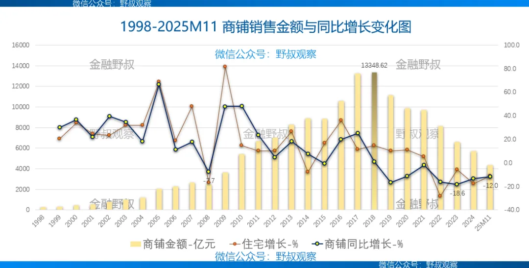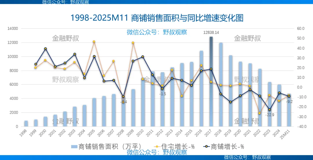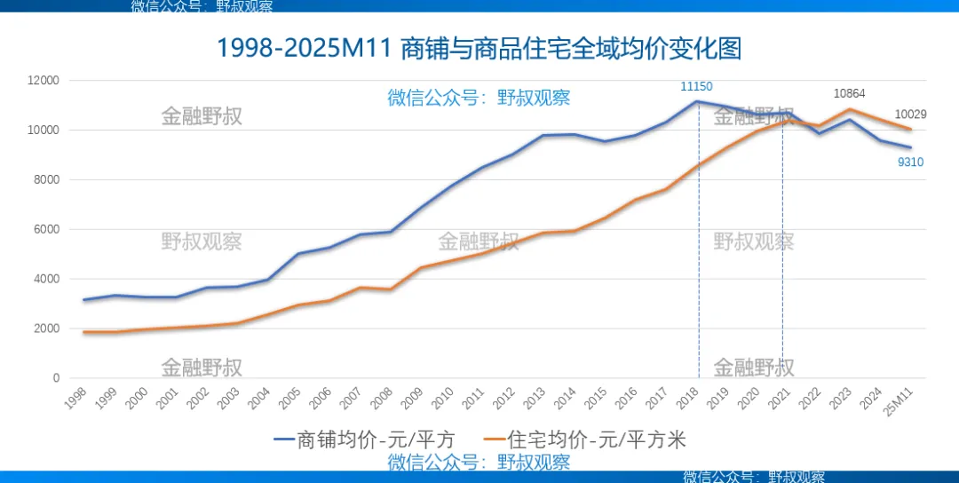 1998-2018年,全域商铺销售均价呈现波动上行趋势;据野叔测算,2018年度达到历史最大值约每平方米11150元。此后,商铺均价开始波动下行;其中2025年前十一个月每平约9310万元(详情见附图4),与2018年峰值相比下降了约16.5%。