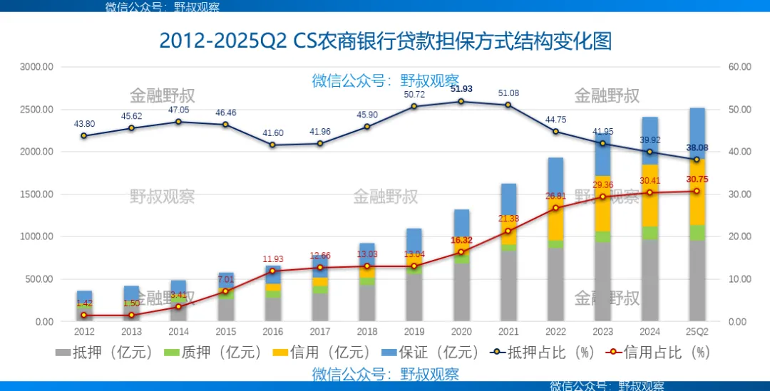 例如,从贷款担保方式结构看,2020年末该行抵押类占比51.93%,达到2012年以来的最大值;同期信用类和保证类的占比分别为16.32%和24.17%,合计都不及抵押类占比。2025年二季度末,该行信用类和保证类贷款占比分别为30.75%和23.86%;同期抵押类贷款占比下降至38.08%(详情见附图5)。