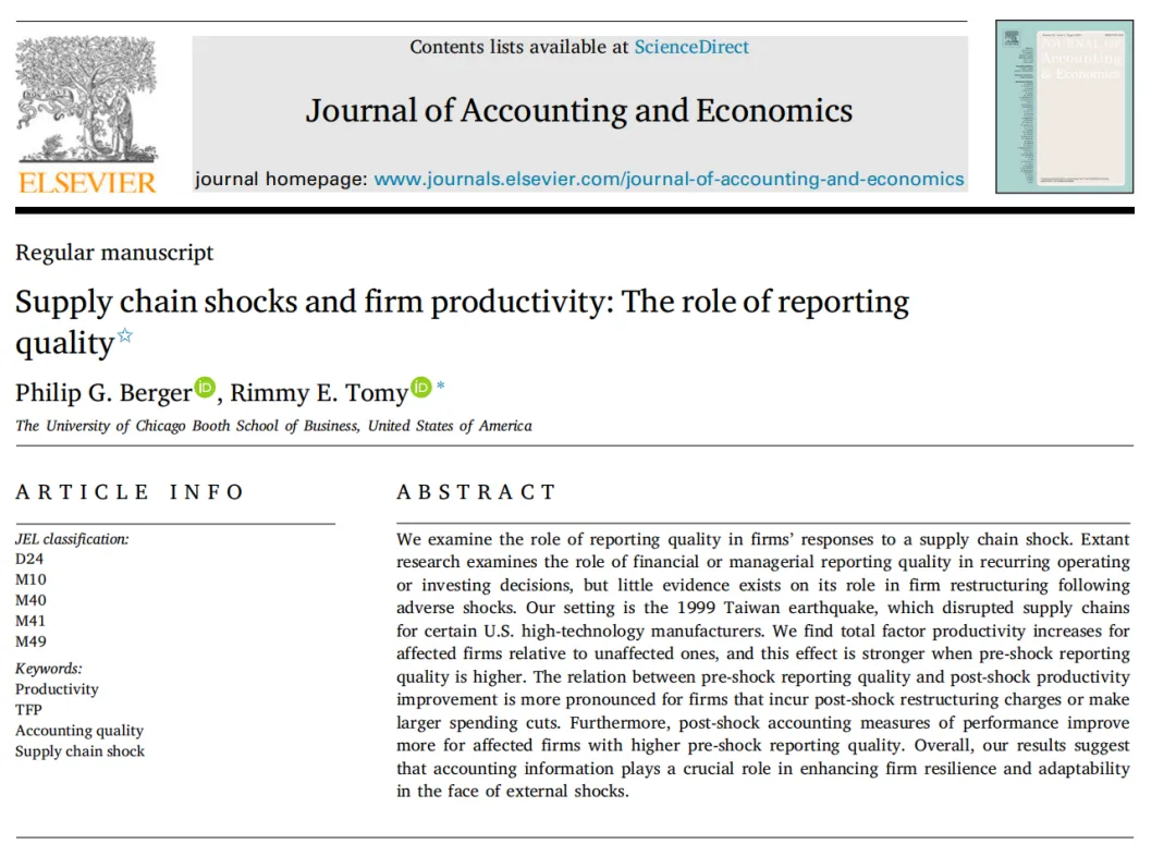 参考文献:Berger, P. G., & Tomy, R. E. (2025). Supply chain shocks and firm productivity: The role of reporting quality. Journal of Accounting and Economics, 101833.