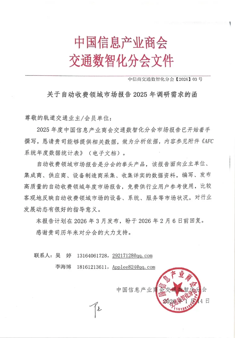 为系统掌握自动收费领域的发展现状与趋势,推动行业数据共建共享,中国信息产业商会交通数智化分会正式启动《自动收费领域市场报告(2025年)》调研工作。本报告将面向轨道交通业主单位、系统集成商、设备制造商等产业相关方,汇集真实、可比、可分析的行业数据,形成具有参考价值的年度市场成果。现诚邀各单位参与本次数据调研工作,共同为行业发展提供可靠依据。