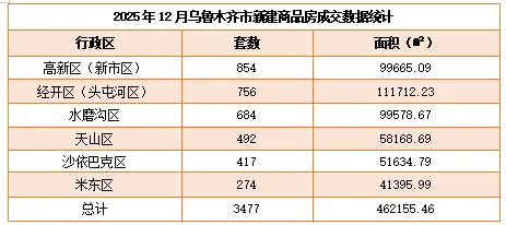 在乌鲁木齐市房地产业协会了解到,2025年12月,乌鲁木齐市新建商品房网签3477套、46.22万平方米;二手房成交网签6353套、63.21万平方米。