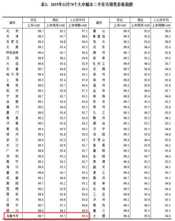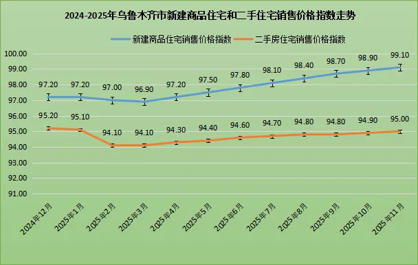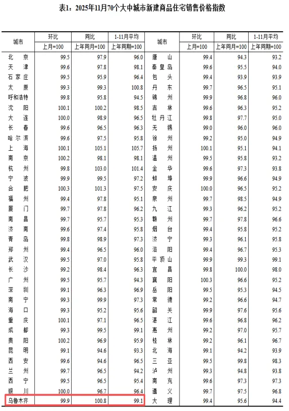4、 乌鲁木齐11月新房价格环比下跌0.10%,二手房价格环比下跌0.30%