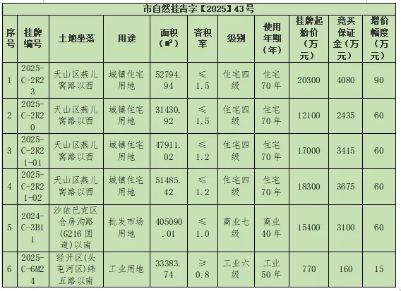 2025年12月份,乌鲁木齐市自然资源局国有建设用地使用权出让公告市自然挂告字【2025】43号。