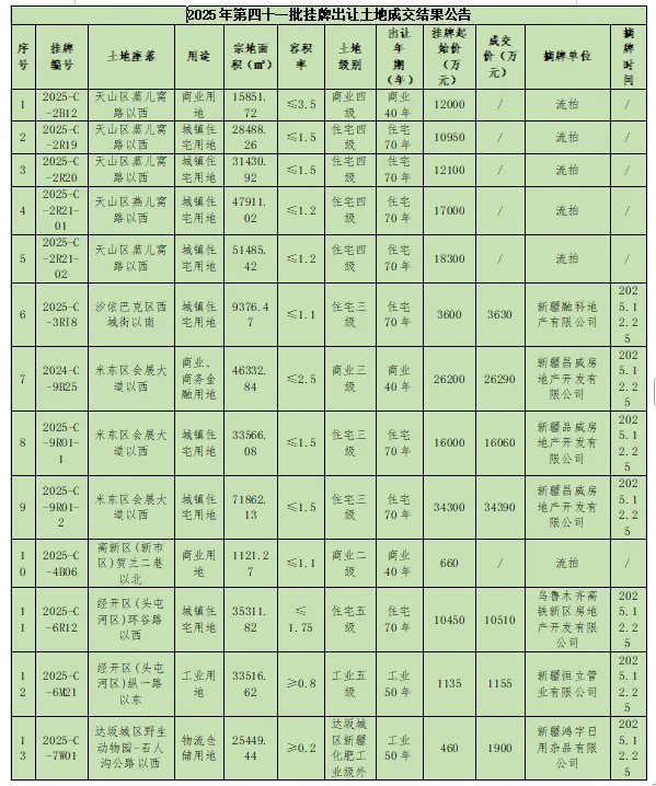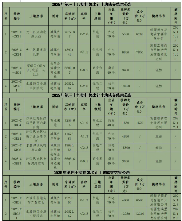 2025年12月,乌鲁木齐市自然资源局挂出:乌鲁木齐市2025年第三十八批、第三十九批、第四十批、第四十一批国有建设用地使用权挂牌出让结果的公告。