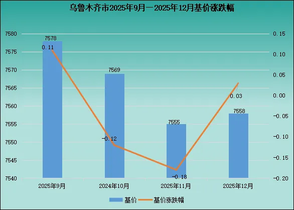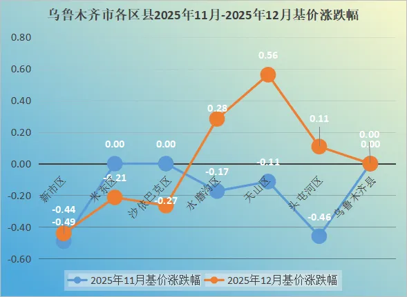 截至2025年12月,德旺V估价系统中乌鲁木齐市一共上线了6区1县并进行了基价数据的发布,2025年12月乌鲁木齐市整体的基价与2025年11月相比上涨0.03%。