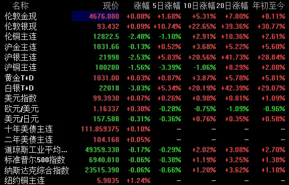 上周五现货黄金价格下跌0.43%,收报每盎司4594.79美元;现货白银价格下跌2.6%,收于每盎司89.94美元。基础金属方面,伦敦金属交易所(LME)三个月期铜价格显著下跌2.5%,收于每吨12780.50美元,触及一周低位。