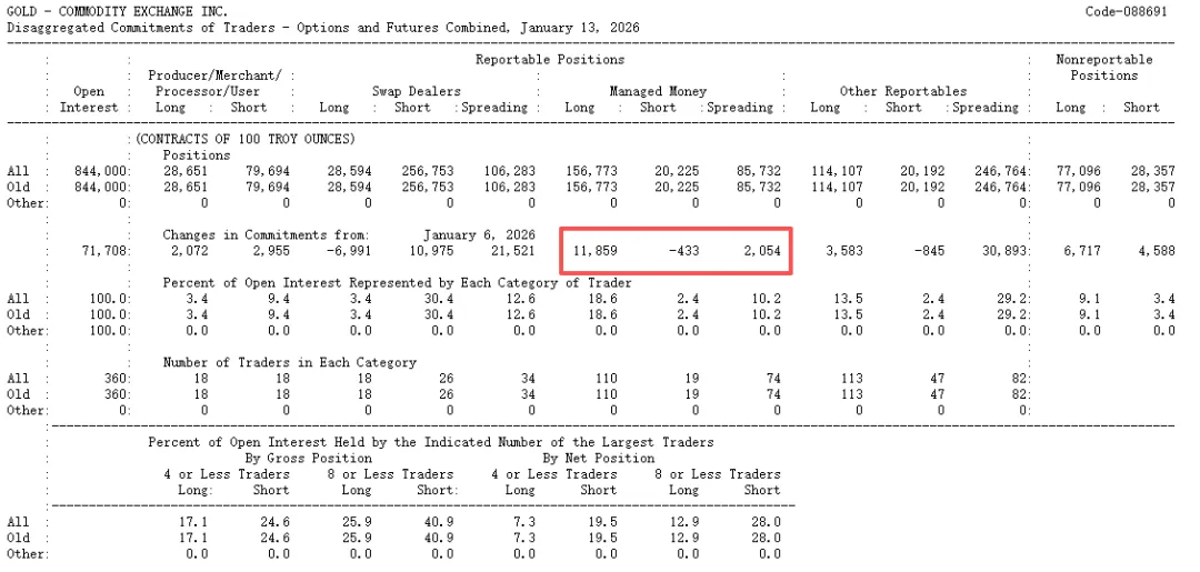 (CFTC最新一周(截止至20260113)黄金期货与期权合并持仓报告,多头增仓11859手)