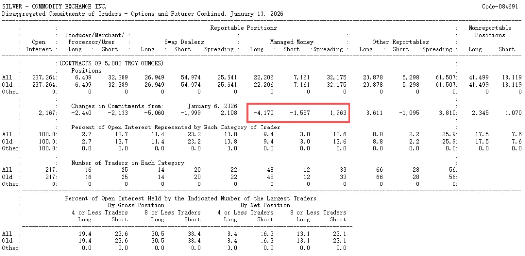 (CFTC最新一周(截止至20260113)白银期货与期权合并持仓报告,多头减仓4170手)