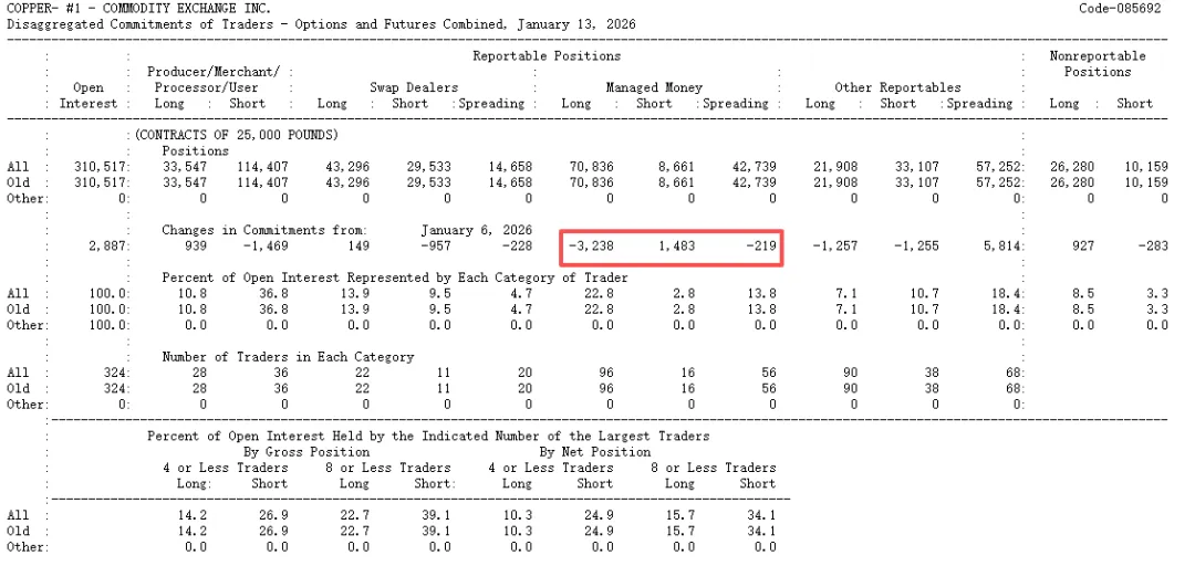 (CFTC最新一周(截止至20260113)铜期货与期权合并持仓报告,多头减仓3238手)
