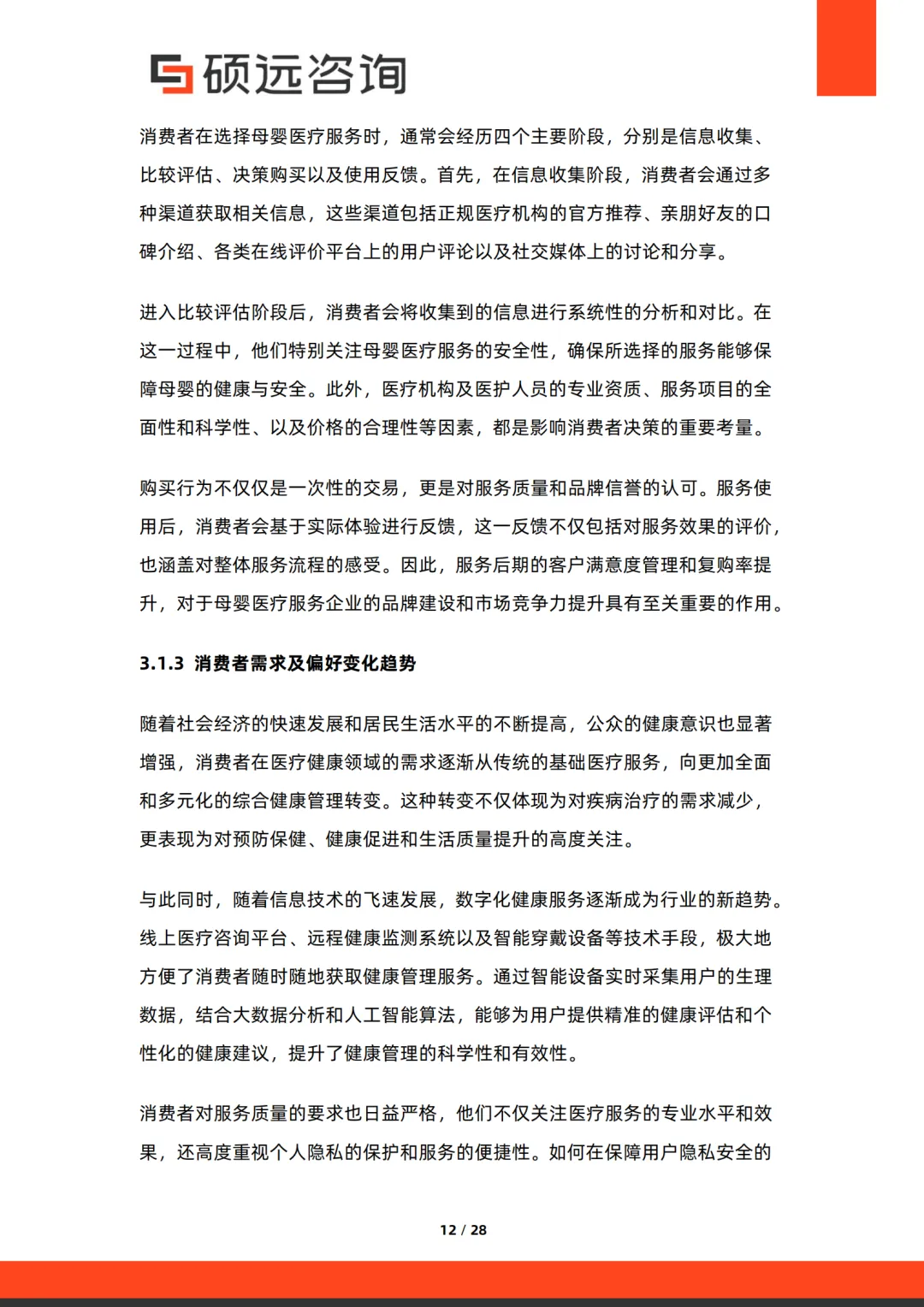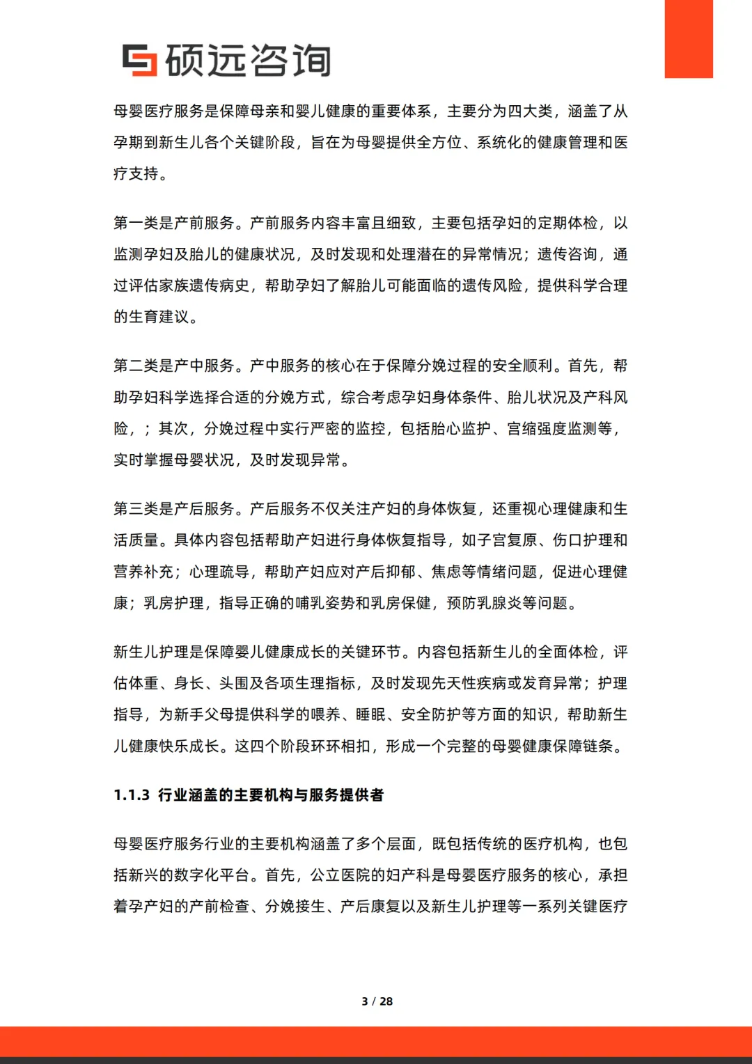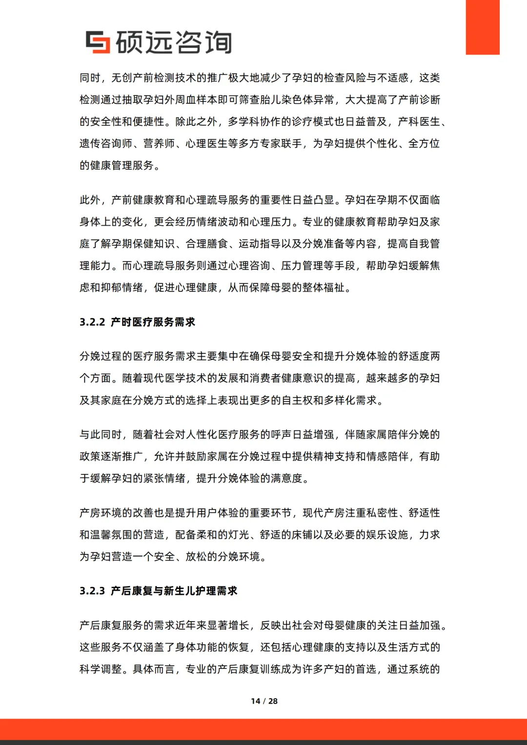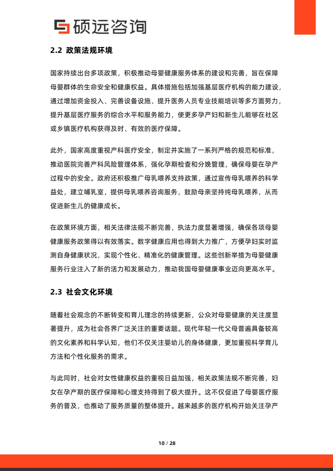 市场环境层面,宏观经济增长与医保体系完善增强了消费者支付能力;政策端《母婴保健法》等法规构建了完善的制度框架,推动服务规范化与资源均衡配置;社会文化方面,科学育儿理念普及,年轻父母对个性化、智能化服务需求凸显。