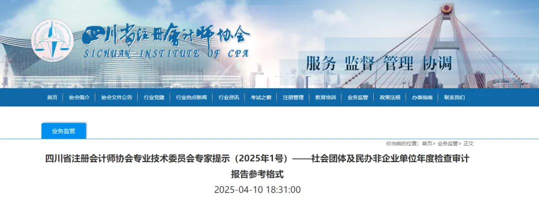 为充分发挥注册会计师执业监督作用,助力民政部门优化服务质量,促进社会团体及民办非企业单位高质量发展,四川省注册会计师协会专业技术委员会对社会团体及民办非企业单位年检审计开展了专项研究,制定了《社会团体及民办非企业单位年度检查审计报告参考格式》,现提供给事务所执行相关业务时使用。