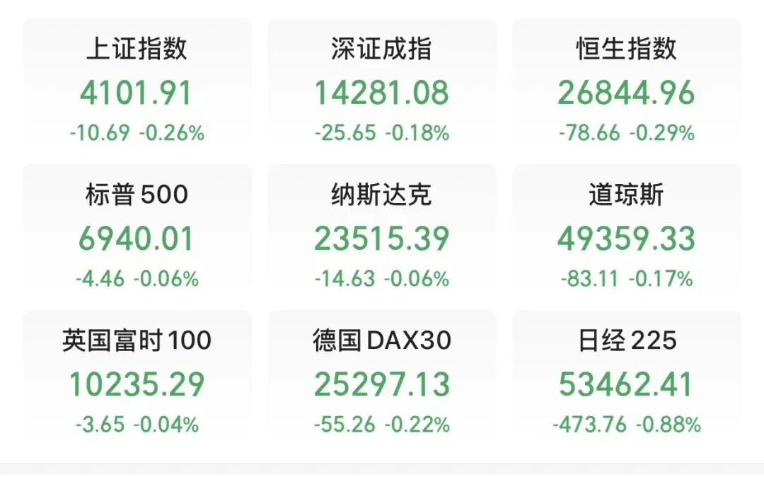· 美股表现:美股三大指数集体收跌。道琼斯工业平均指数下跌0.17%,纳斯达克综合指数下跌0.06%,标普500指数下跌0.06%。芯片与航天板块逆市走强,费城半导体指数上涨1.15%,美光科技大涨超7%。