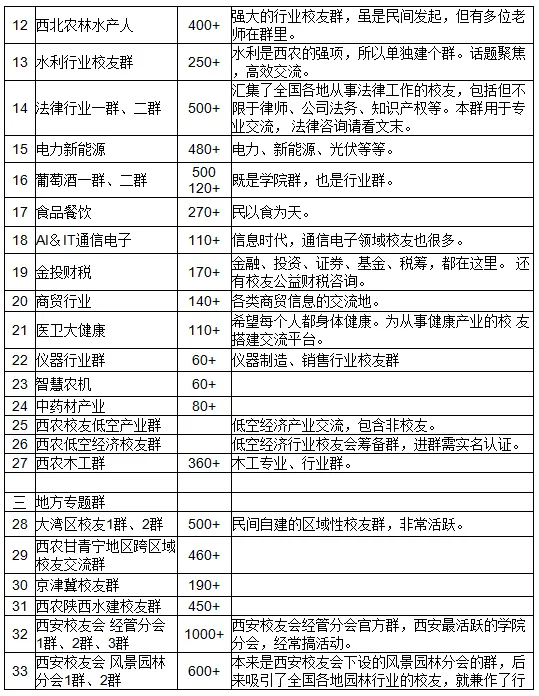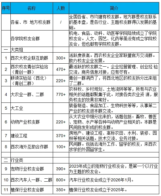 1、这些群,有些是精准的行业分类,如宠业、植保行业、汽车人校友群;有些是宽泛的分类,如大农业校友群;有些是学院校友群兼具行业校友群功能,如葡萄酒群、西安园林分会群。形成的缘起各有不同,初衷都是为了更好的服务校友。让我们用好微信群这个工具,凝聚校友力量,共创美好未来。