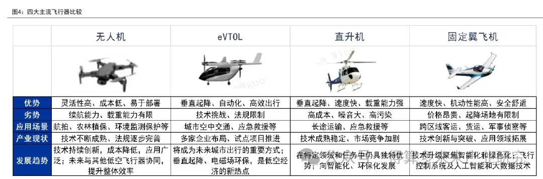 • 在整机制造环节,以无人机和eVTOL为代表的新兴飞行器蓬勃发展,与传统的直升机和固定翼飞机共同形成了新旧共存的格局。四种主流低空飞行器各具特点,如图所示。