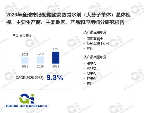 当前,全球聚羧酸高效减水剂(大分子单体)市场正处于高速增长阶段。据GIR(Global Info Research)调研,2025年全球该市场收入约为20.29亿美元,预计到2032年将攀升至37.50亿美元,2026至2032年期间年复合增长率(CAGR)高达9.3%。这一强劲增长映射出全球基建投资加码、装配式建筑普及以及对低碳高强混凝土需求激增的现实趋势。
